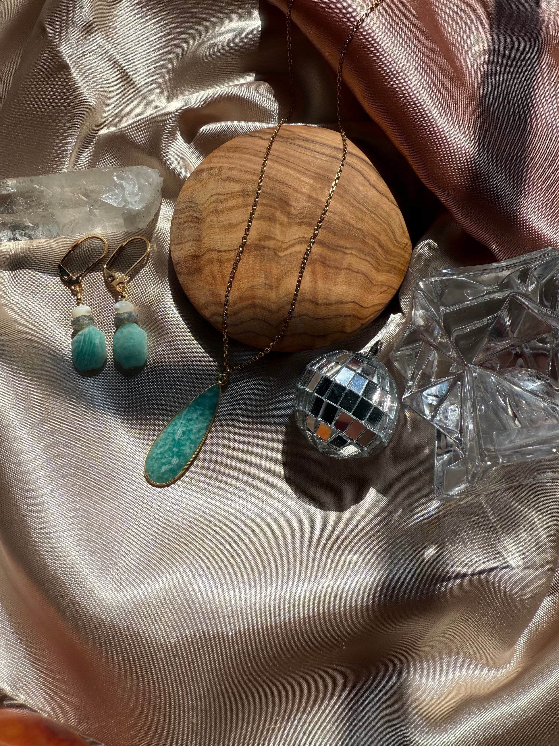 Blue green toned stone that brings courage and calm. Holding, or especially wearing of the stone, provides a peacefulness to the neural system of the body.