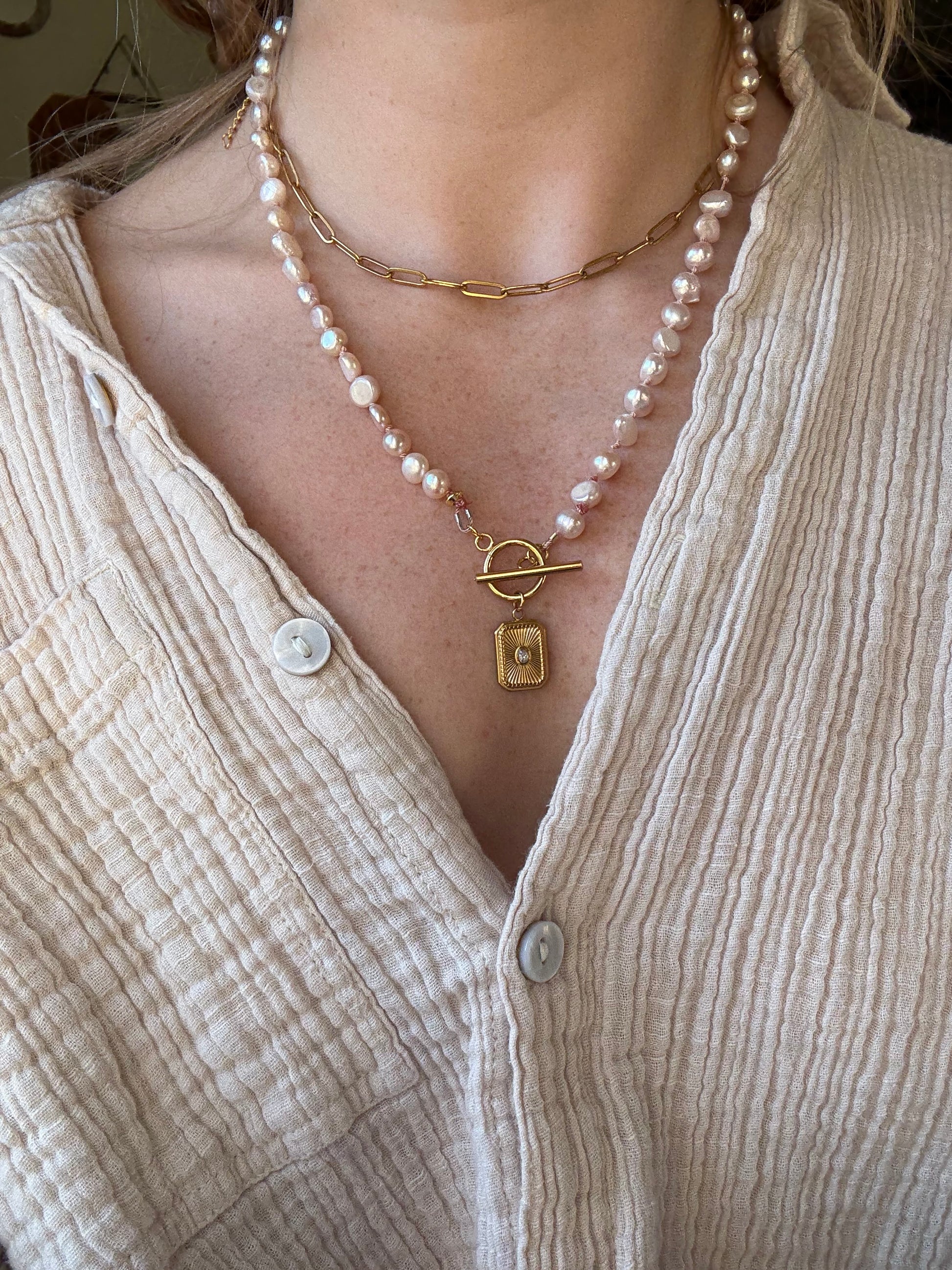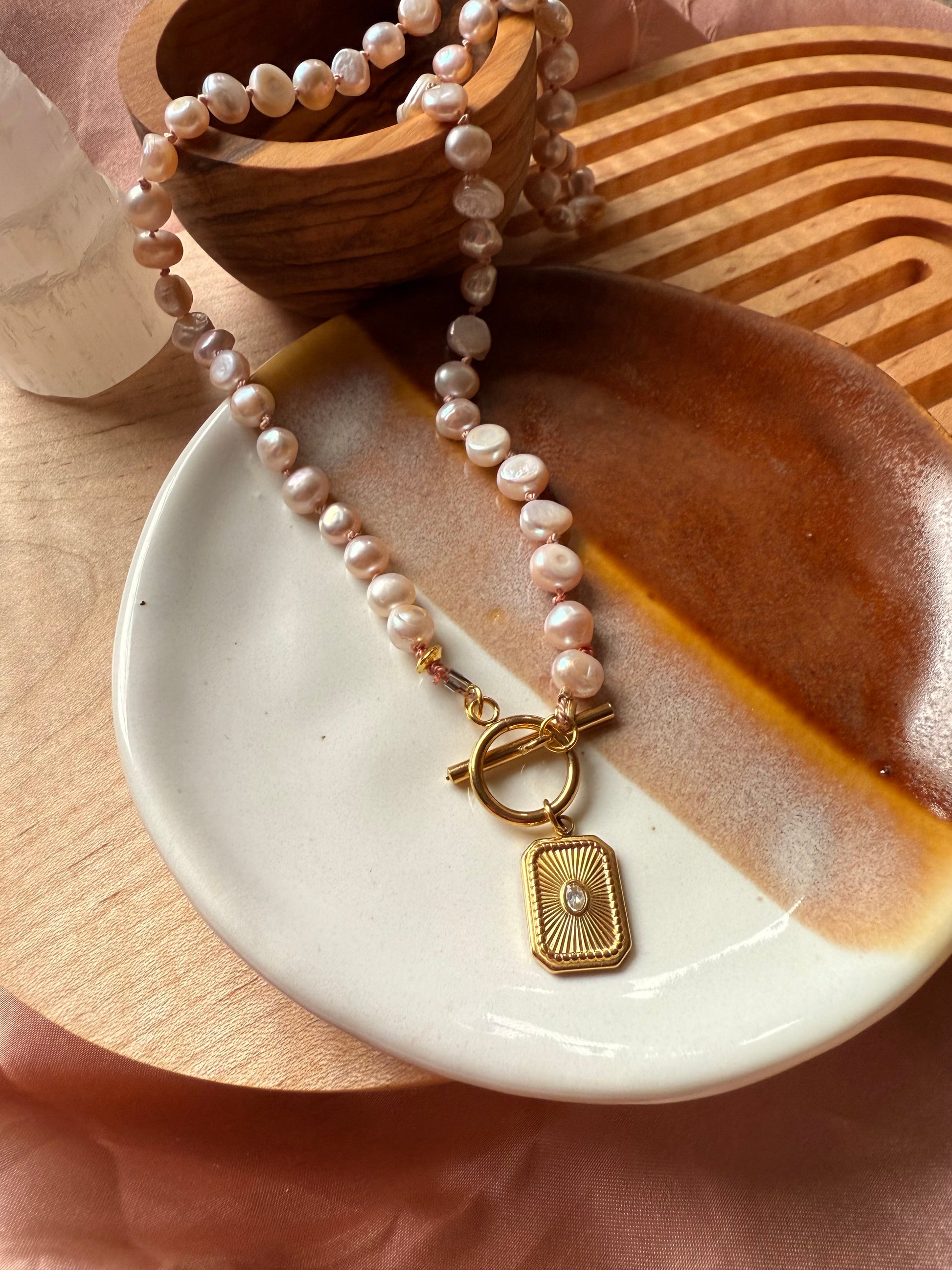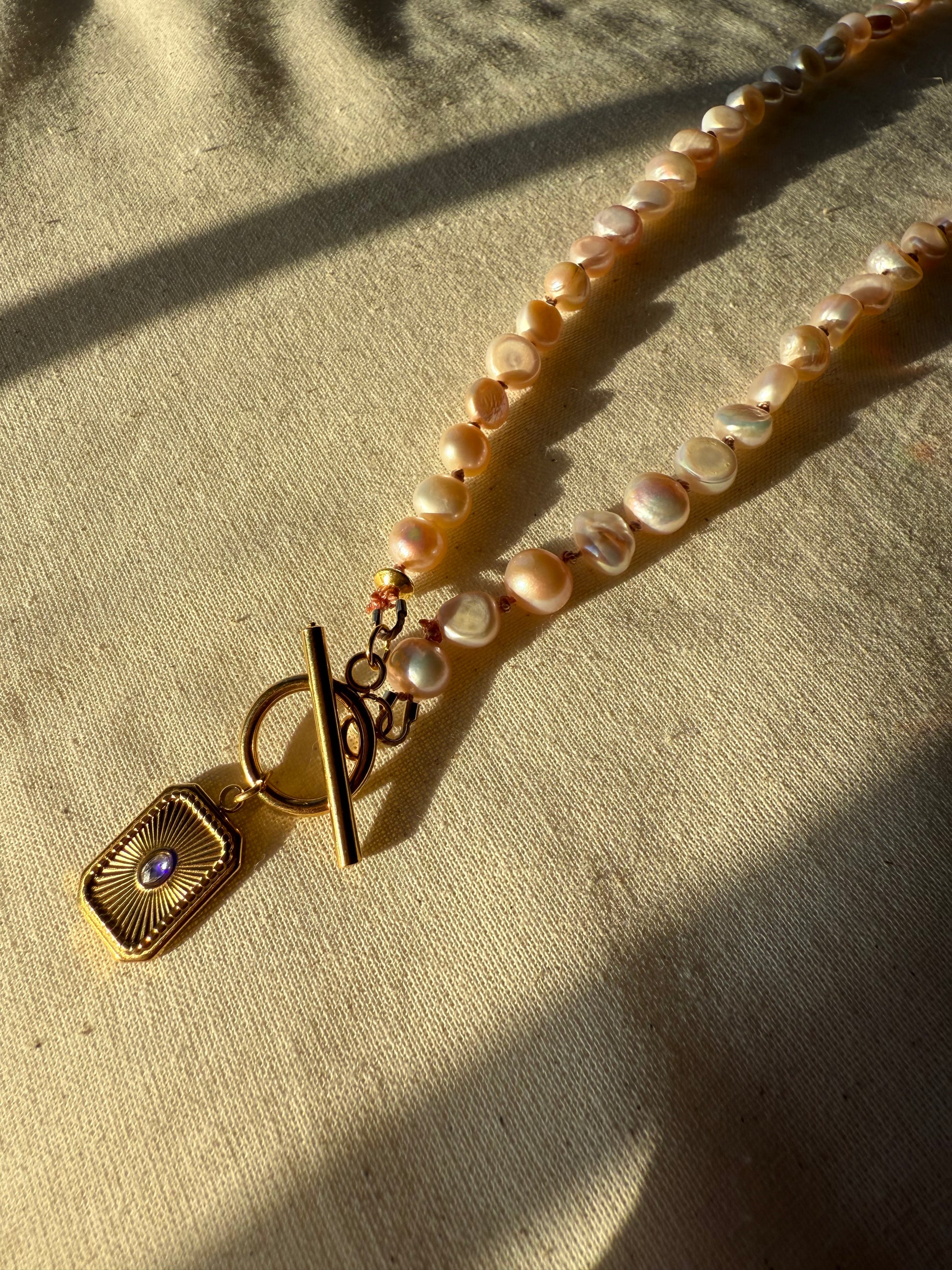This necklace features mauve pearls on a silk cord using a knotted technique. There is an OT toggle clasp and a topaz pendant. The necklace is 17 inches in length