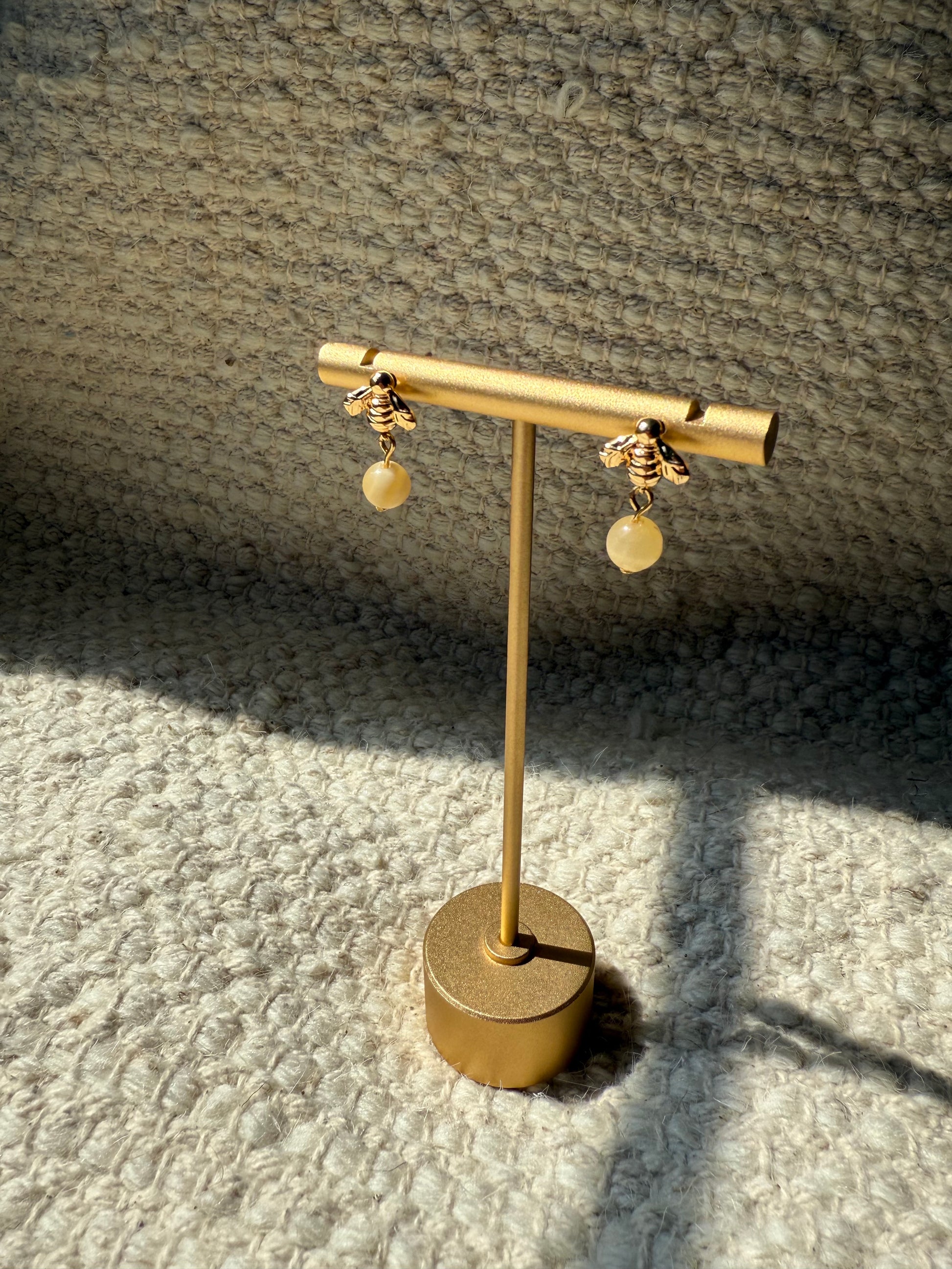 Gold filled bee studs with a dangling yellow jade bead, an ode to our pollinators!